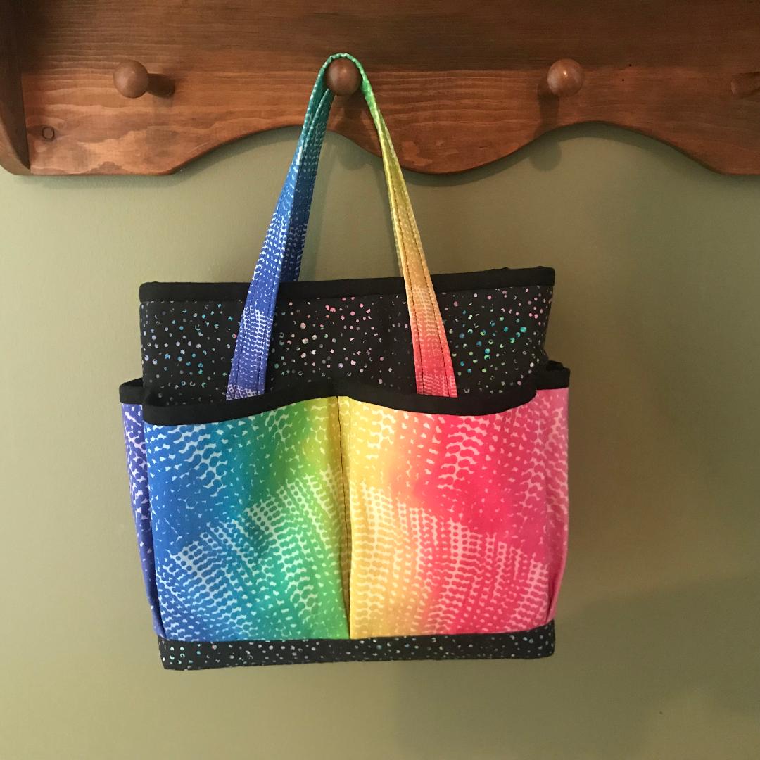 The second bag is a fun bag consisting of bright neon colors and mottled textures. It is made from a panel, where all the pieces are printed on the fabric. There are no frustrations of getting the measurements precisely correct. The directions and illustrations on the panel made it easy to sew together.